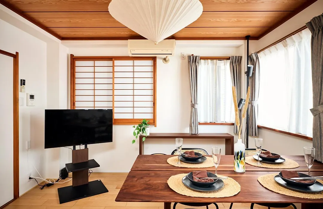 The kitchen amenities at the Tokyo villa feature an electric kettle, a fridge, and kitchenware, provided in an outdoor dining area. Shinjuku Saboten Yaguchi Watari Shotengai is a restaurant serving Japanese dishes not far from Ukiyoe House 3Br 75M2 With 60M2 Deck Sauna villa. Ukiyoe House 3Br 75M2 With 60M2 Deck Sauna villa can be reached by car in 20 minutes from Tokyo International airport.